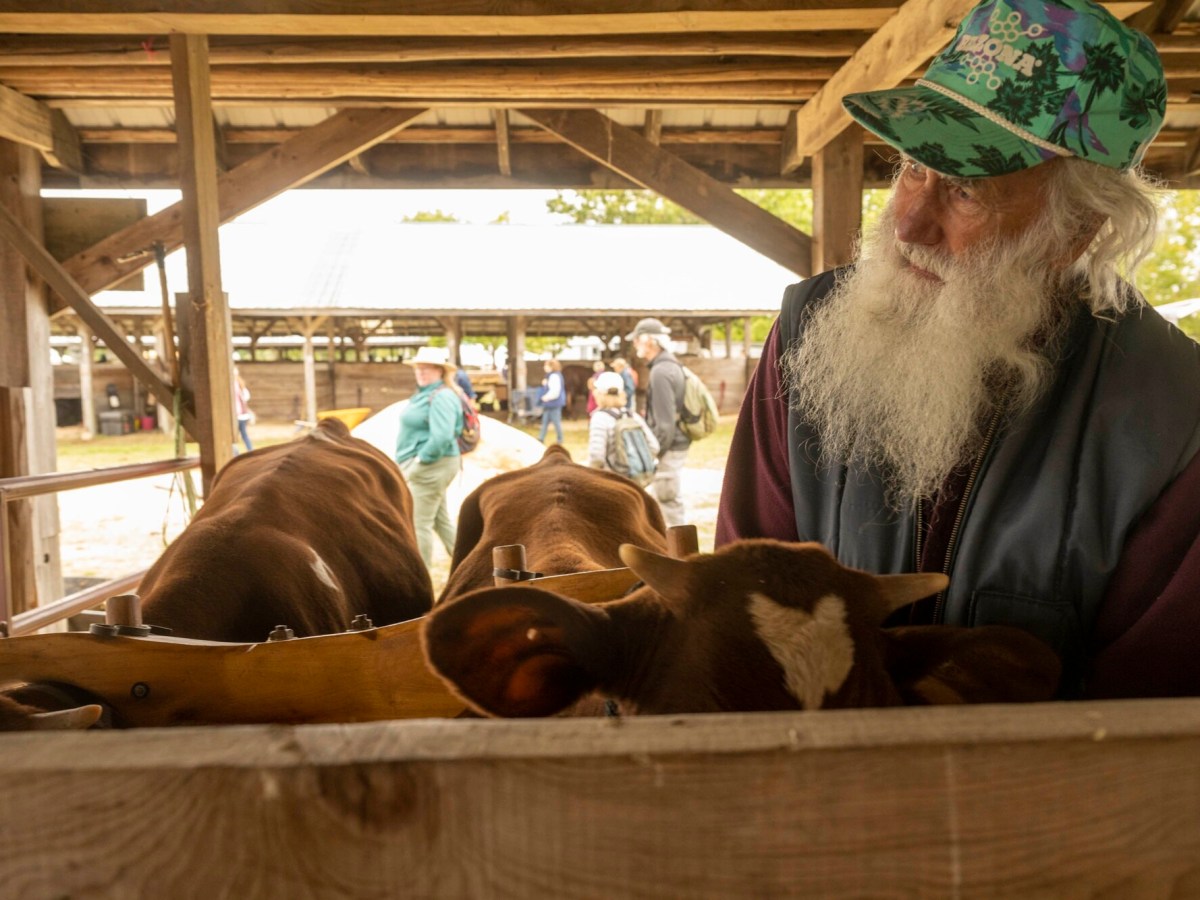 Bill Shores of Vassalboro brings Cracker and Jack, his team of Chianina steers, to compete in the steer scooting competition, one of several events in which they are to compete in this summer.