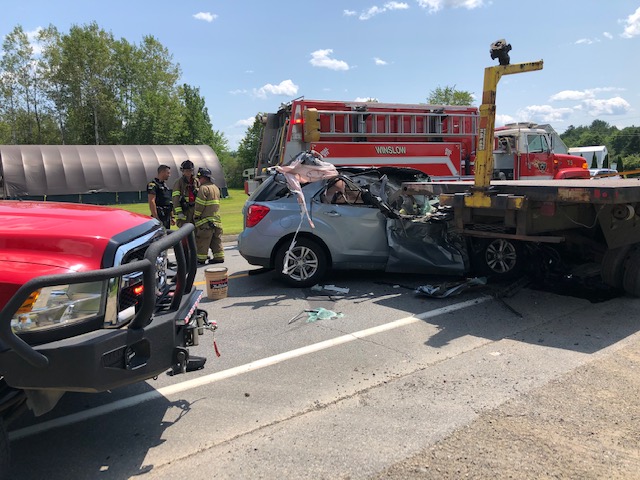 The truck was stopped on the side of Augusta Road when a Chevrolet Equinox sport utility vehicle crashed into the left rear of the flatbed, smashing the passenger side of the SUV.