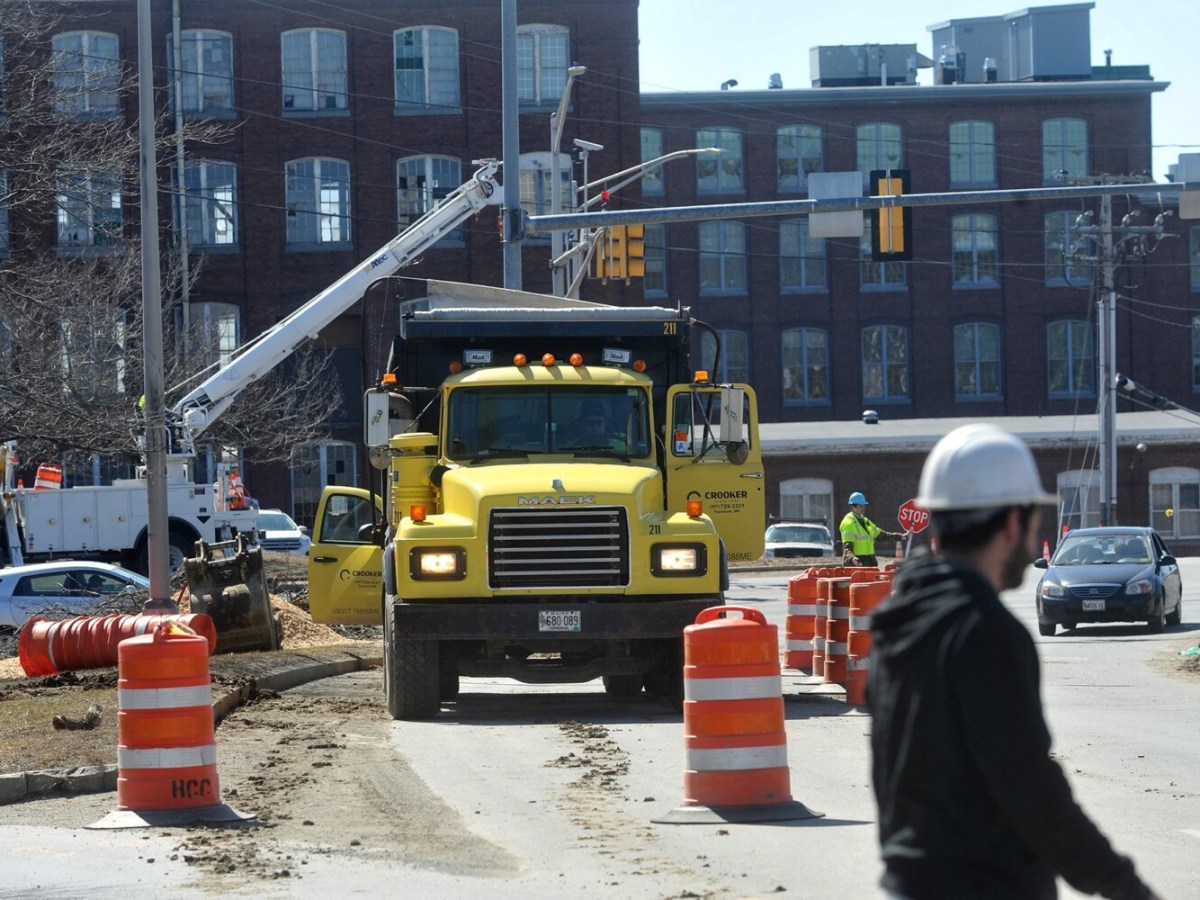 Workers from Crooker Construction Inc. of Topsham took down trees on a traffic island near Front Street on Monday morning and planned to remove curbing and put gravel on the site.