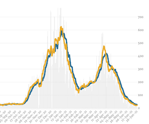 The seven-day average of daily new cases stands at 25.1, compared to 192.9 a month ago.