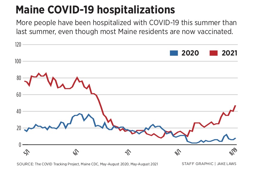 The statewide tally of inpatients confirmed with the disease has hit the highest level since early June, with Bangor’s Eastern Maine Medical Center seeing the sharpest spike.