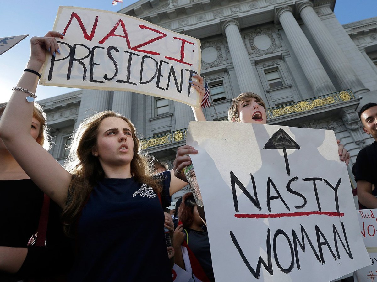 High school students march through downtown San Francisco, and several thousand people chant ‘Not my president’ in front of Trump Tower in Chicago.