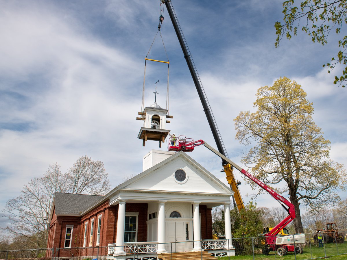 Students old and new watched as the bell tower in the former Monmouth Academy building was hoisted into place Thursday.