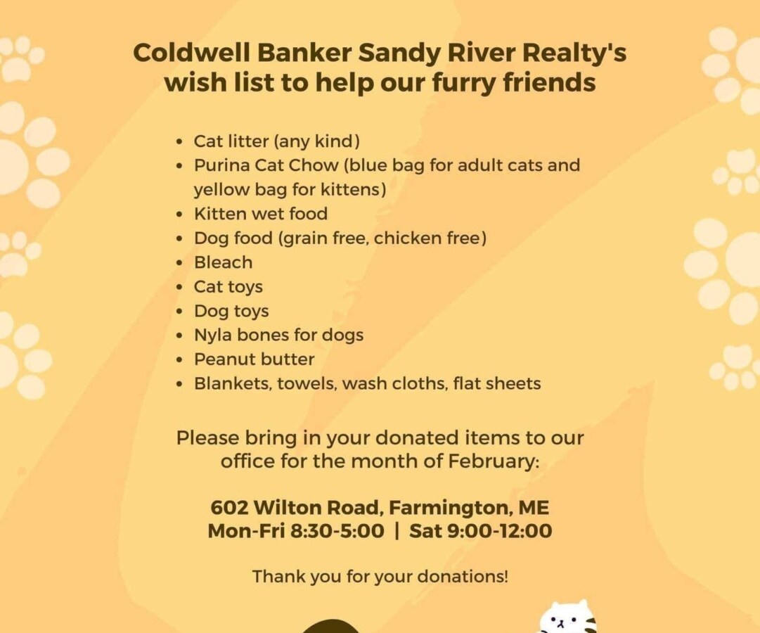 Coldwell Banker Sandy River Realty will be accepting donations of pet food and other pet related items for the month of February, which they will give to the shelter at the end of the month.