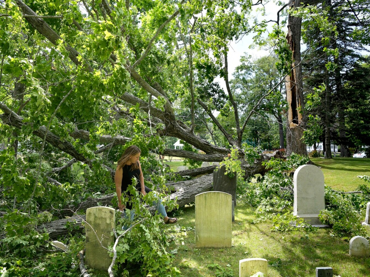 Maple tree estimated at 200 years old split during Tuesday’s storm, damaging historic headstones that volunteers have been working for years to reassemble and put back where they belong.