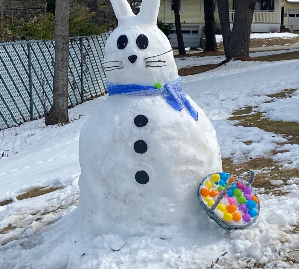 Hallowell Fire Chief James Owens, his wife Brenda Owens, stepdaughter Ashley Healey and granddaughter Madilynn Irish try to spread some Easter cheer Sunday for all their Farmingdale neighbors on Burke Street by building Mr. Bunny and writing an Easter message for all to see.