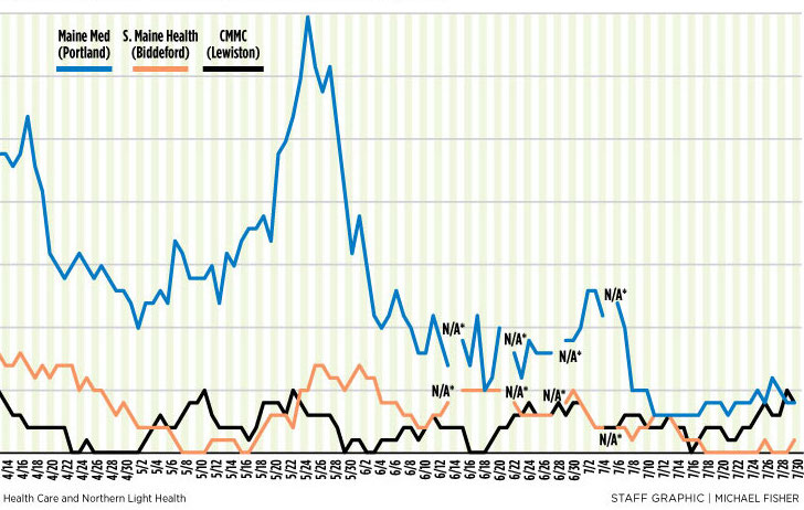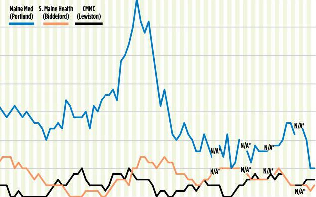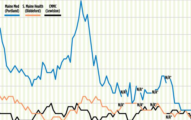 MaineGeneral in Augusta had no patients all week, while Central Maine Medical Center, Maine Med and Mercy saw upticks.