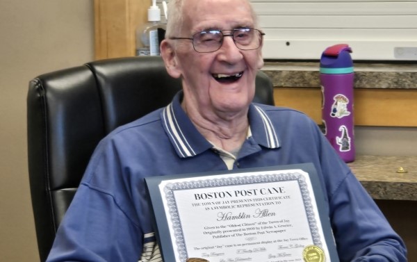 Jay Town Manager Shiloh LaFreniere presented her grandfather with the Boston Post Cane on Monday during a celebration at the Town Office.