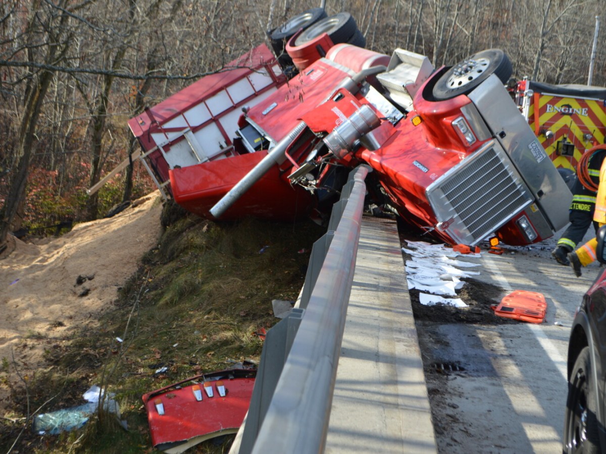 The cab landed on a guardrail and the load of sawdust spilled down an embankment.
