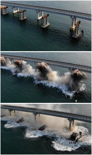 The bridge footings of the old Beals Island Bridge are turned to rubble in a flash, and bang.