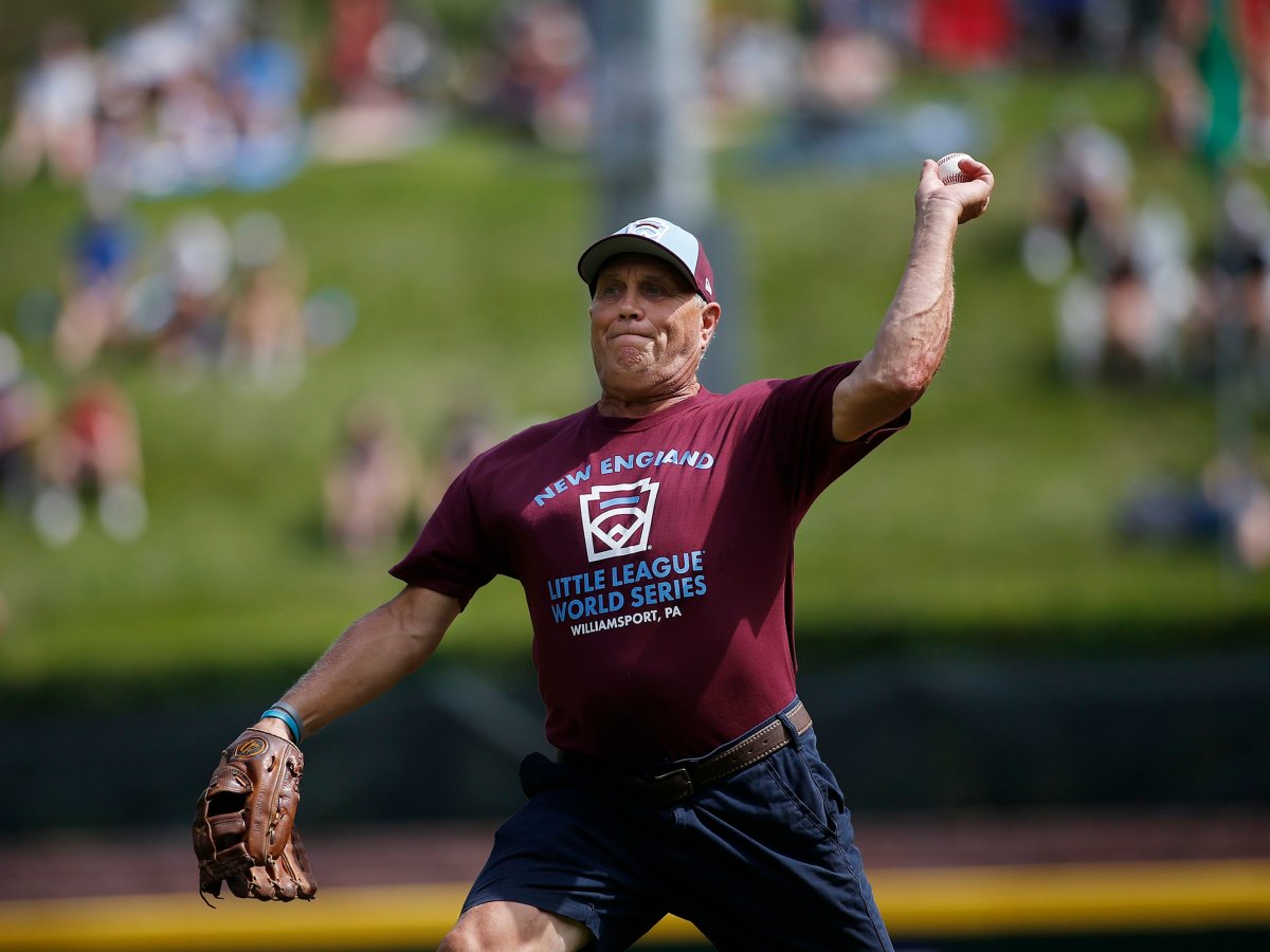 Jeffrey Keezer, who played for the Augusta team at the 1971 Little League World Series, throws out the first pitch before Gray-New Gloucester/Raymond’s opening game.
