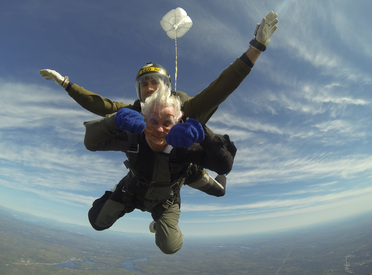 An 86-year-old Lewiston great-grandmother and three other generations of her family celebrate with a parachute jump.