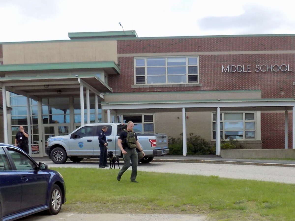 Four state police K-9s searched Spruce Mountain Middle School after note found in bathroom.