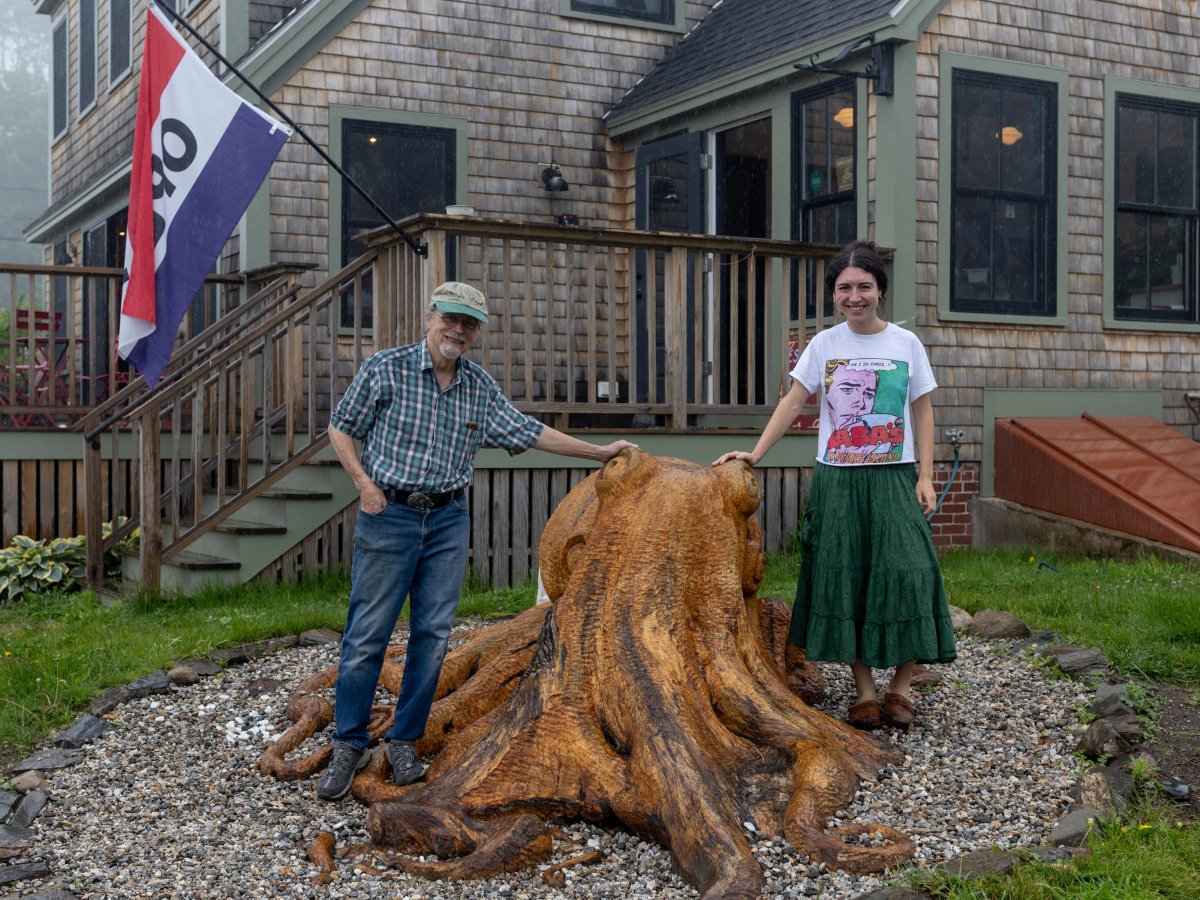 Artist’s chisel transforms stump outside Peaks Island cafe into an octopus