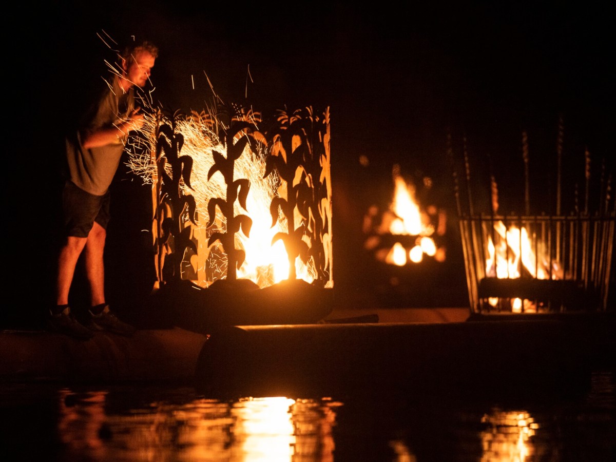 The steel fire sculptures, which floated downriver Saturday when the water level rose, were first lit during Skowhegan’s Kennebec on Fire event held in August 2021.