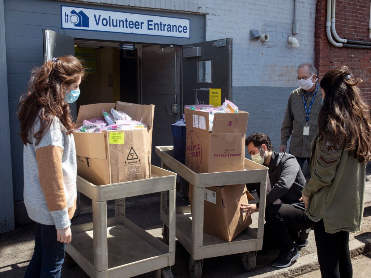 A small group of volunteers is distributing personal hygiene kits containing items donated from local businesses to Portland’s Preble Street shelter.