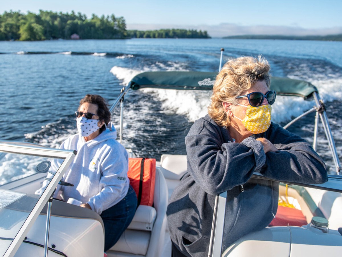 Long-time volunteers Peggy Dorf and Bonnie Eletz share their love of loon counting on Thompson Lake.