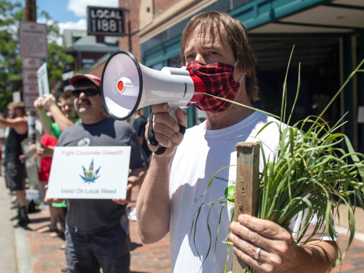 Protesters are upset that state’s biggest marijuana company, Wellness Connection, is using the courts to open the recreational market to out-of-state competition.