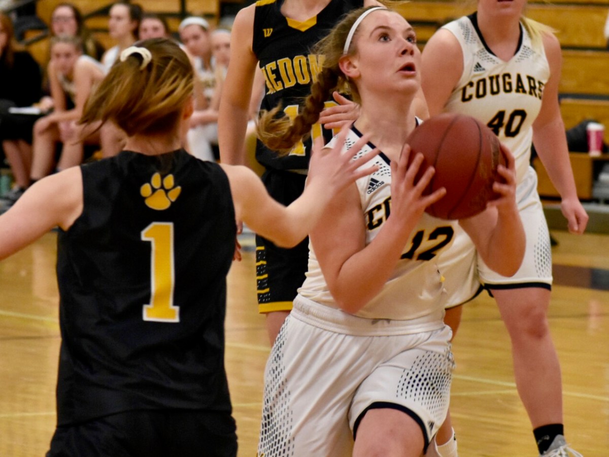 Senior Lexi Mittelstadt scores a game-high 19 points and sophomore Eva Stevens helps out with 14 to lead the Cougars to a 57-49 victory.