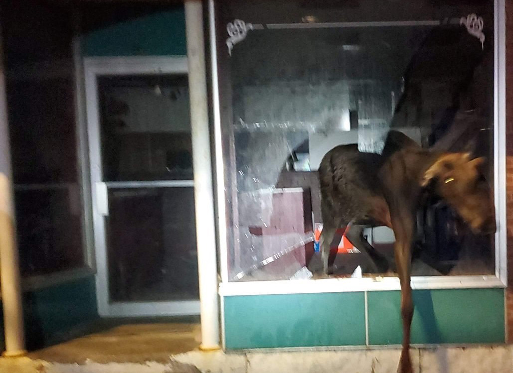 The moose, which had been seen around town in the previous few days, broke through the window of the abandoned restaurant early Friday.