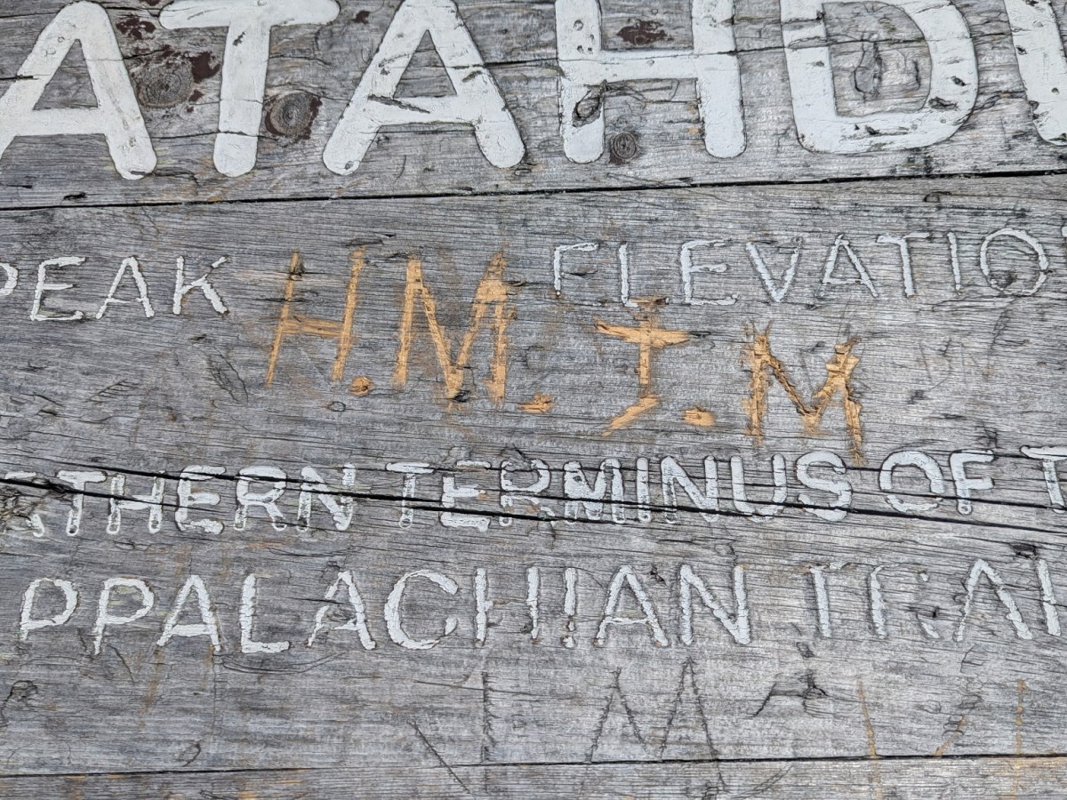 The letters ‘H.M.’ and ‘J.M’ were etched into the middle of the sign at the northern terminus of the Appalachian Trail, the state park said Thursday.
