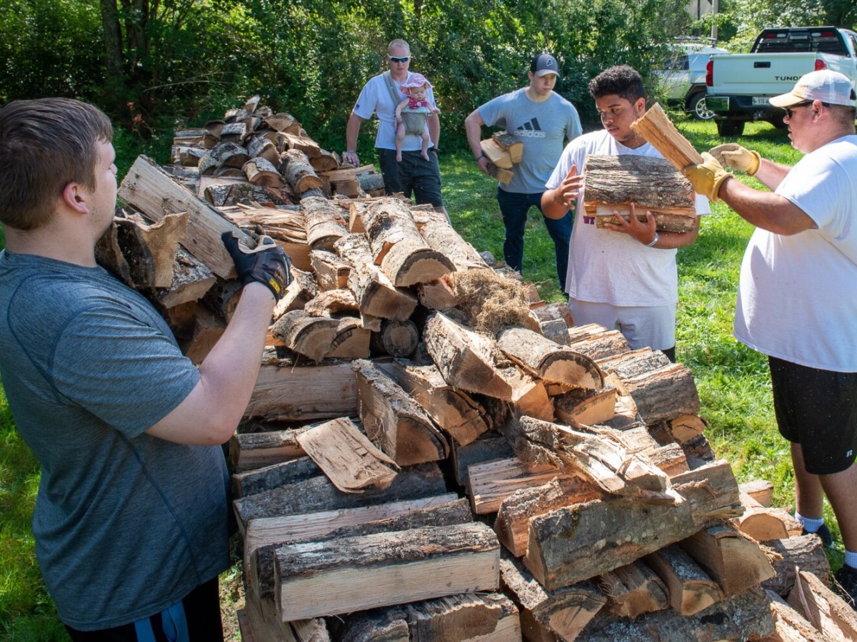 Sabattus Police and football players helped disabled veteran Karl Dostie move wood in his yard Wednesday morning.