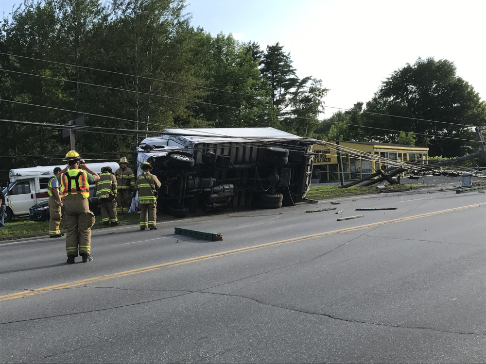 The single-vehicle accident happened Tuesday night on Kennedy Memorial Drive, where a truck headed toward Waterville flipped over and took out three utility poles.