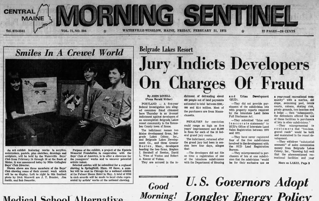 Feb. 21, 1975: Jury indicts developers of Belgrade Lakes resort community on charges of fraud, U.S. governors agree on ‘alternate energy sources’, and is a UMaine school of medicine in the works?