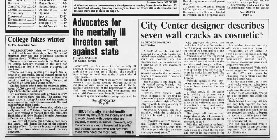Feb. 22, 1989: Augusta Civic Center designer describes seven wall cracks as cosmetic, advocates for mentally ill threaten suit against state, and meter reads ‘undecided’ on downtown Augusta parking