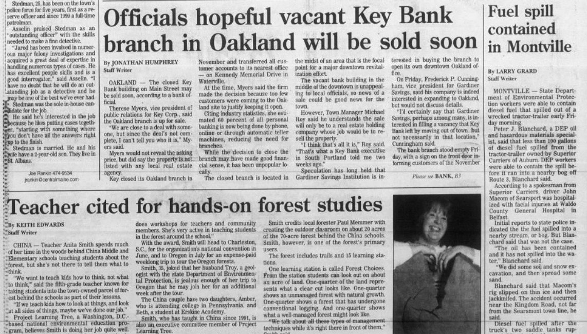 Feb. 23, 2002: Officials hope vacant Key Bank building in Oakland will be sold soon, officials contain fuel spill in Montville, and this China Middle/Elementary school teacher being recognized