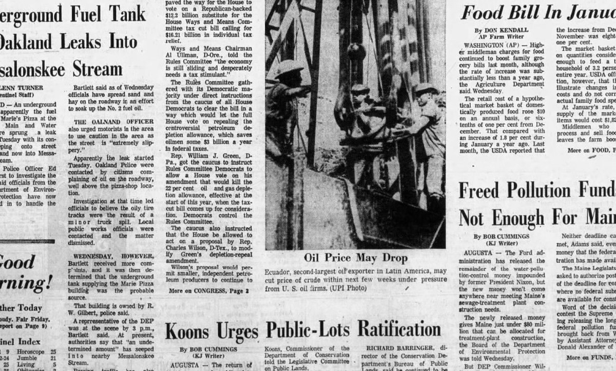 Feb. 27, 1975: Underground fuel tank in Oakland leaks into Messalonskee stream, and UMaine chancellor calls Gov. Langley’s cuts ‘disaster’