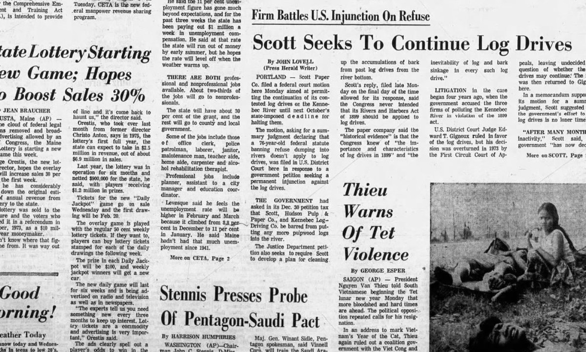 Feb. 11, 1975: Maine State Lottery starts new game this week, state to start filling 690 jobs today under new $3.8 million grant, and its crime-prevention week in Waterville