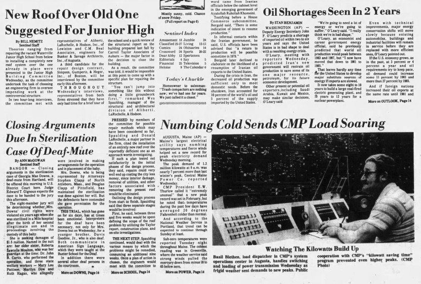 Feb. 15, 1979: New roof over old one suggested for Waterville Junior High School, and numbing cold sends Central Maine Power electricity demand soaring yesterday, and nationwide oil shortage predicted in 2-6 years