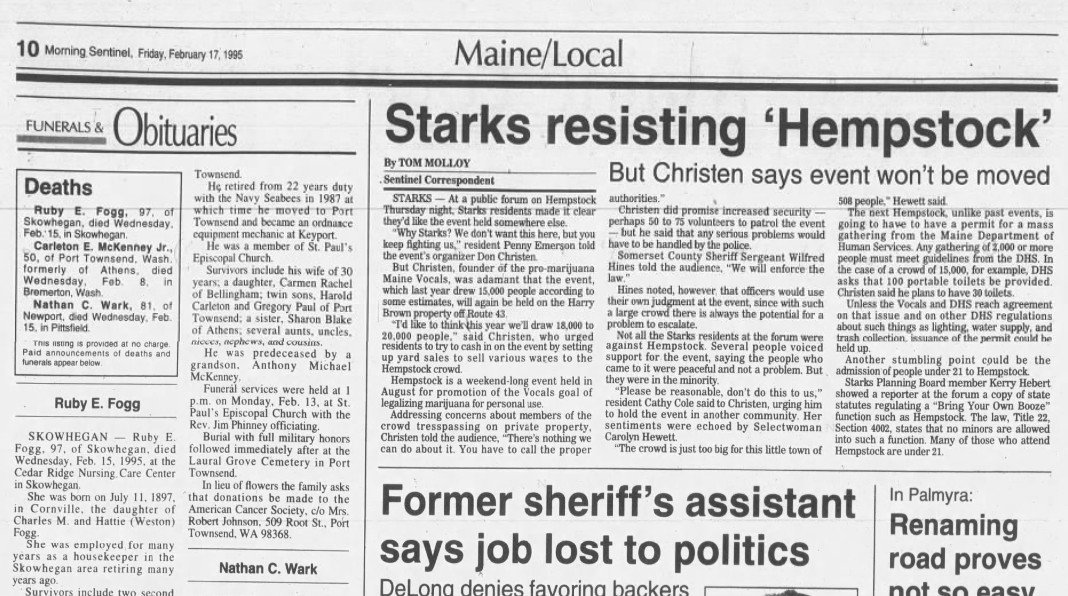 Feb. 17, 1995: Former Somerset County Sheriff’s assistant says her job was lost due to politics, and town of Starks is resisting ‘hempstock’