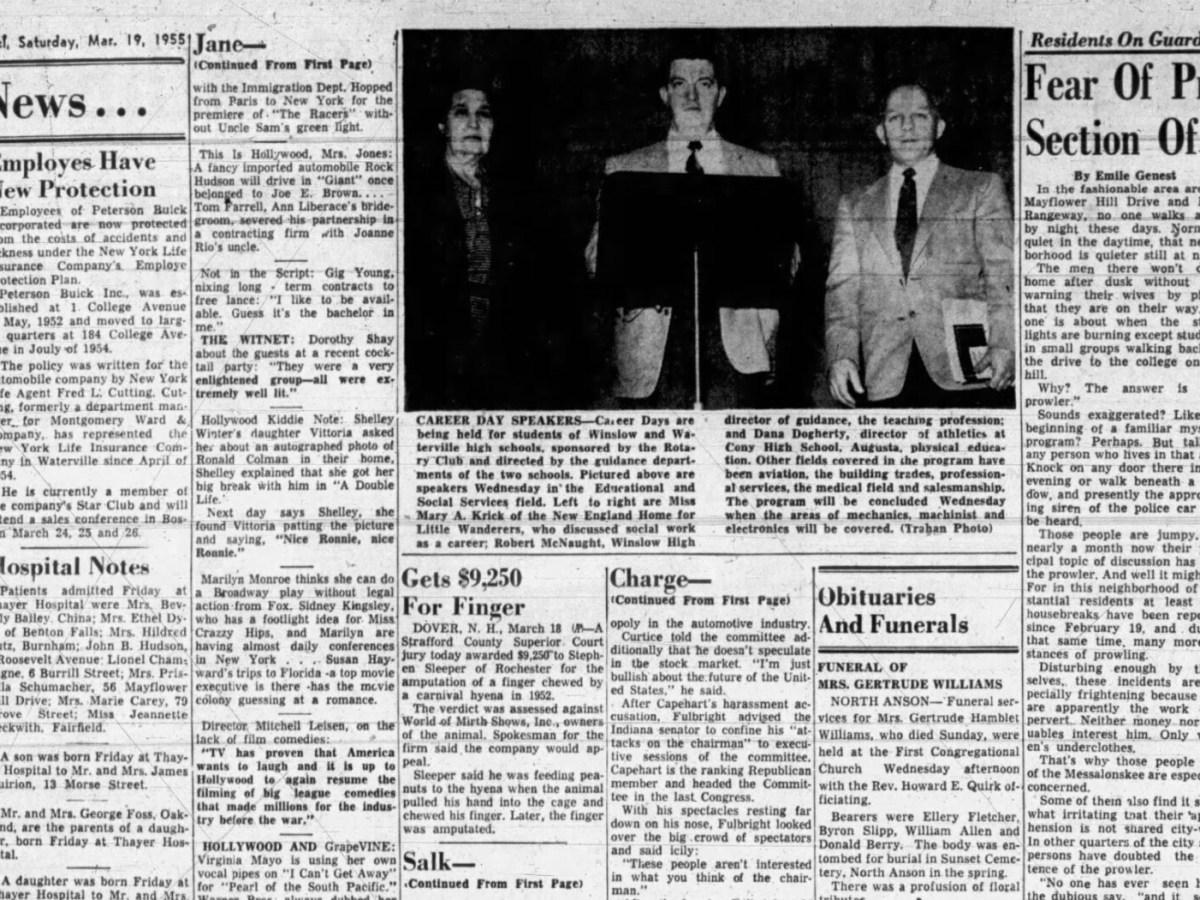 March 19, 1955: Fear of prowler haunts section of Waterville, longtime employee of J.C. Penney appointed Manager for two days a week, and NH man gets over $9K from judge for amputation of his finger after it was chewed by a carnival hyena