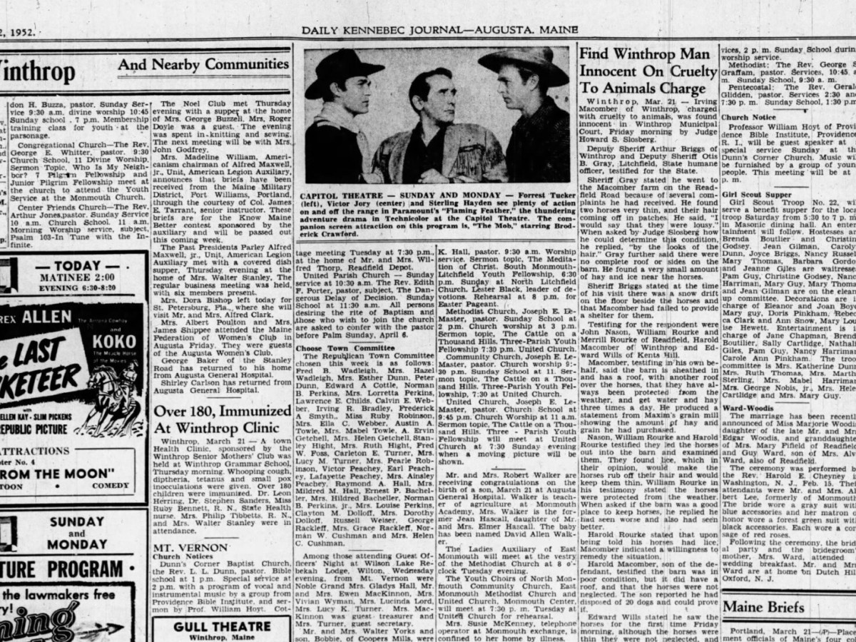 March 22, 1952: Winthrop man innocent on charge of cruelty to animals, eight become sick after eating midnight snack of egg and minced ham sandwiches, and seven killed in Austria after snow slide was set into motion by thawing