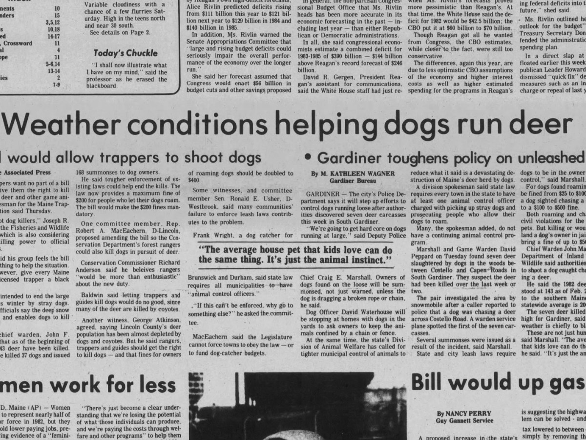 Feb. 26, 1982: Bill would allow trappers to shoot dogs; at the same time, Gardiner toughens its policy on unleashed dogs, and are women working for less?