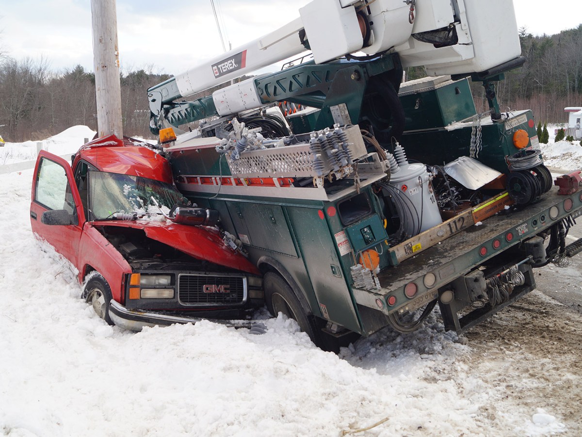Robert Sanborn, 38, of Paris suffered a cut to his head when he drove into the path of a utility bucket truck in Norway, police say.