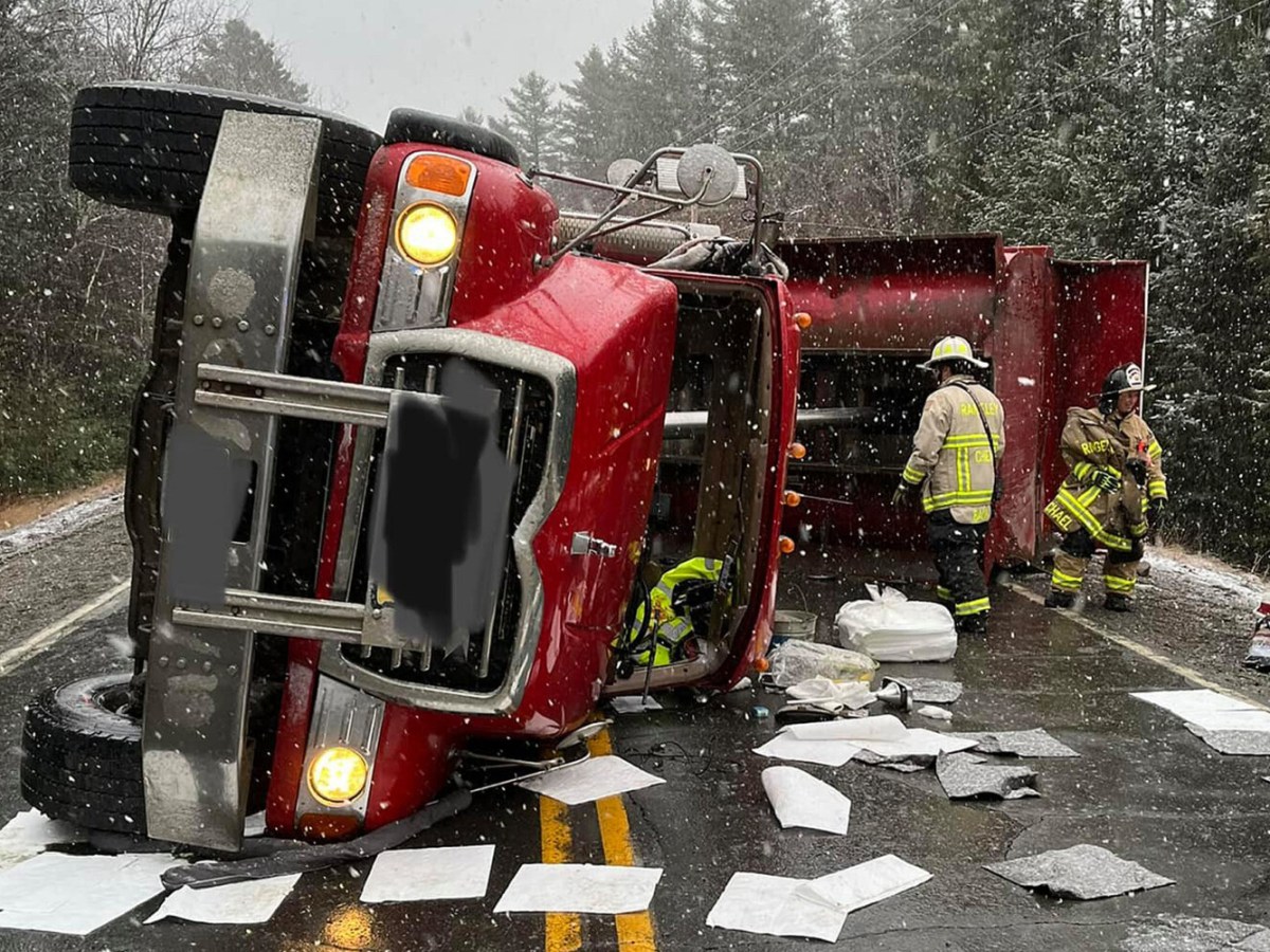 Dump truck rolls, traps driver on Route 16 in northern Oxford County