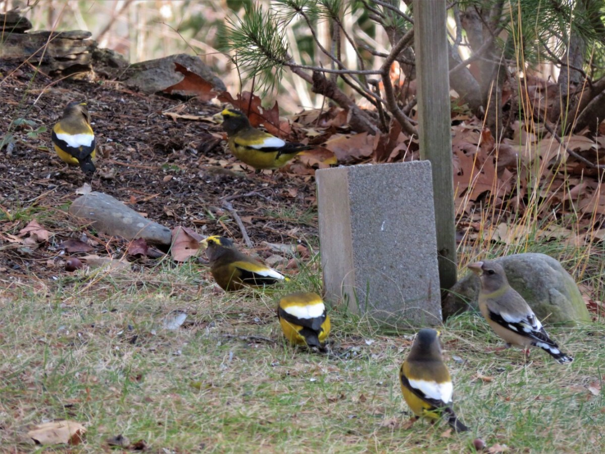 Evening Grosbeaks visit Palermo, three groups of four, seven and 12 passing through in the past week or so.