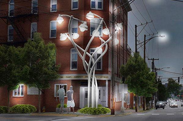 About 50 Portlanders turn out to get a look at the public art project proposed for a space in front of the Odd Fellows building on Forest Avenue.