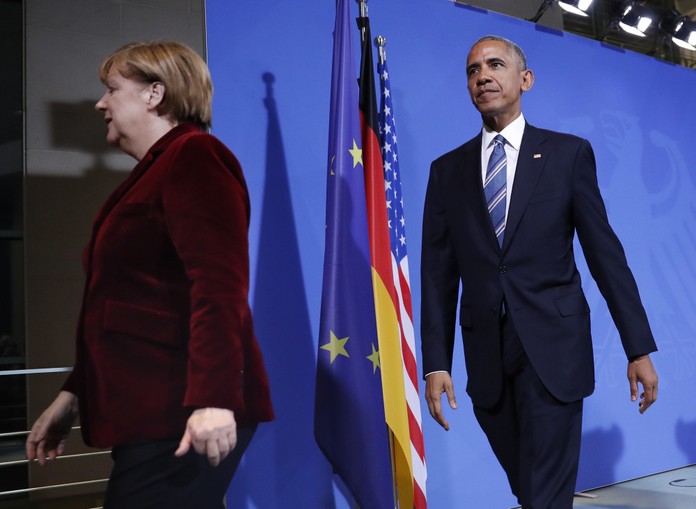 Obama and German Chancellor Angela Merkel each made statements that appear to serve as a point-by-point refutation of some of President-elect Trump’s most contentious foreign policy pledges.