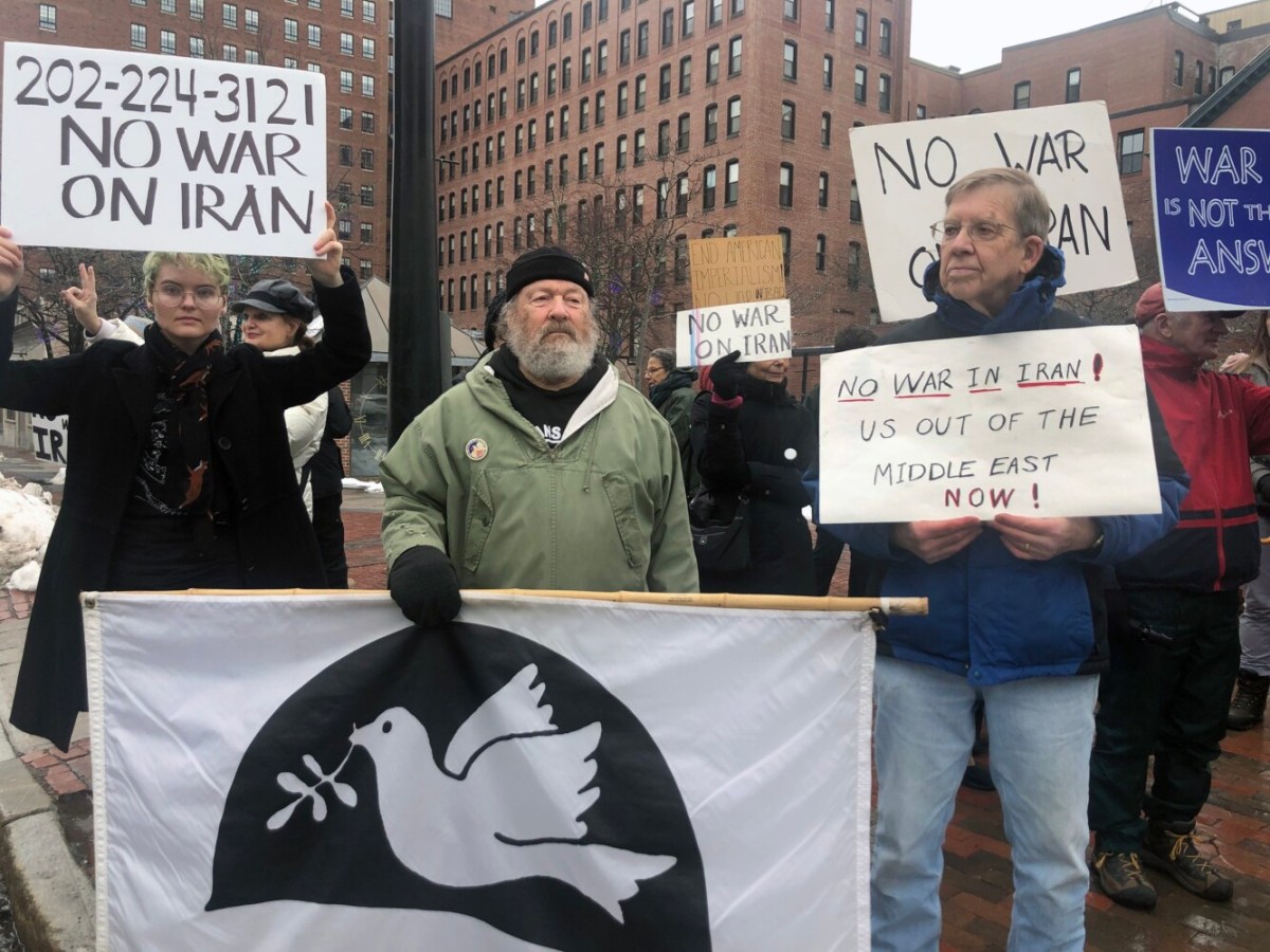 The crowd in Congress Square Park calls for peace after the killing of an Iranian general by a U.S. drone raises fears of a widening conflict.