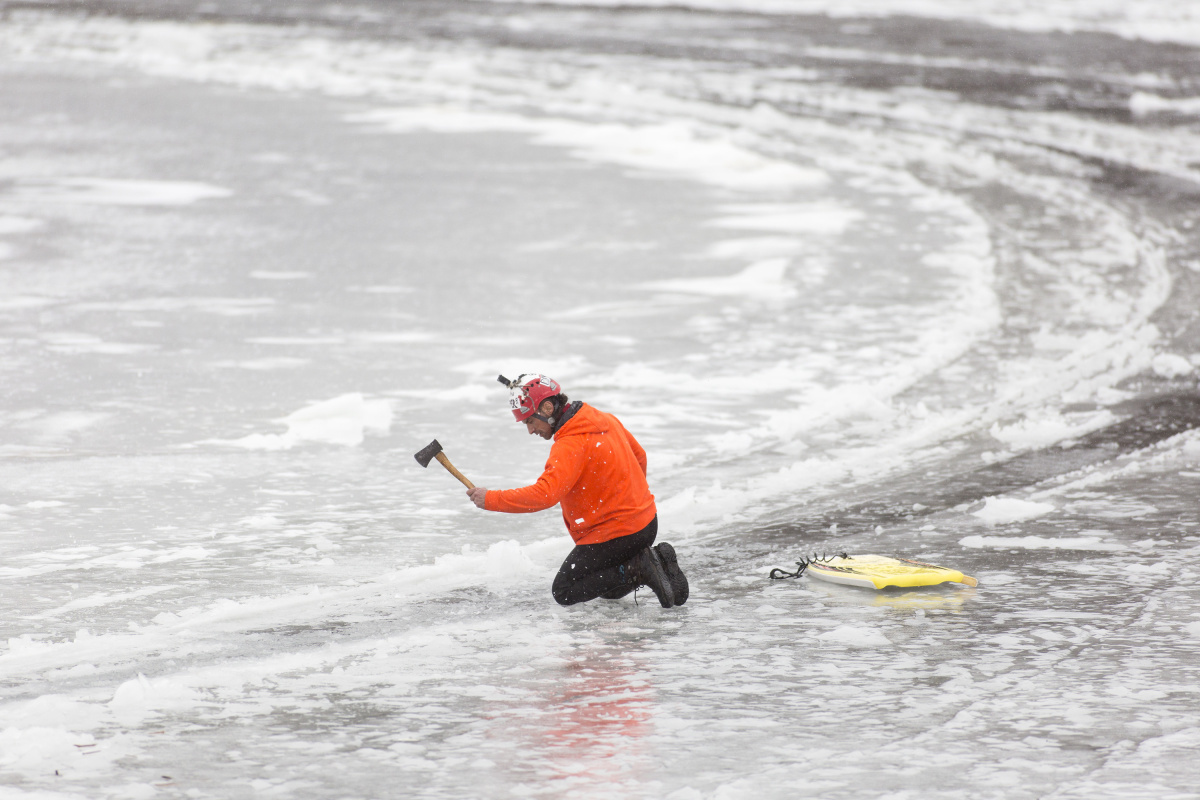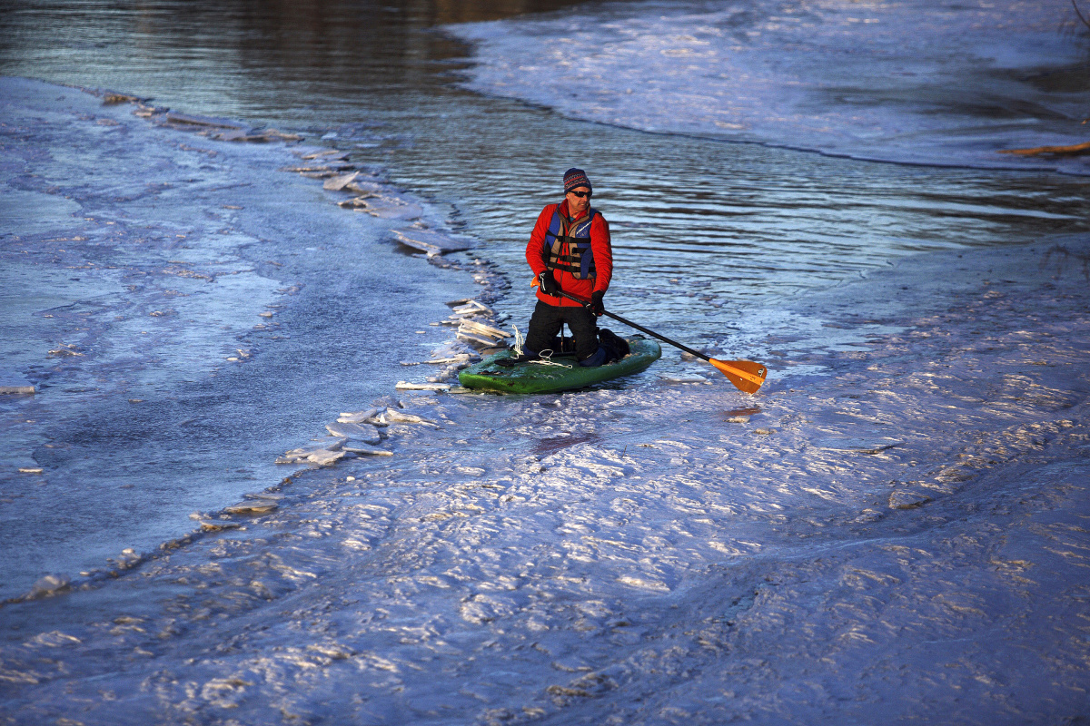 The paddler had more success than a man who tried walking onto the massive ice disk Wednesday, only to be stopped by police.