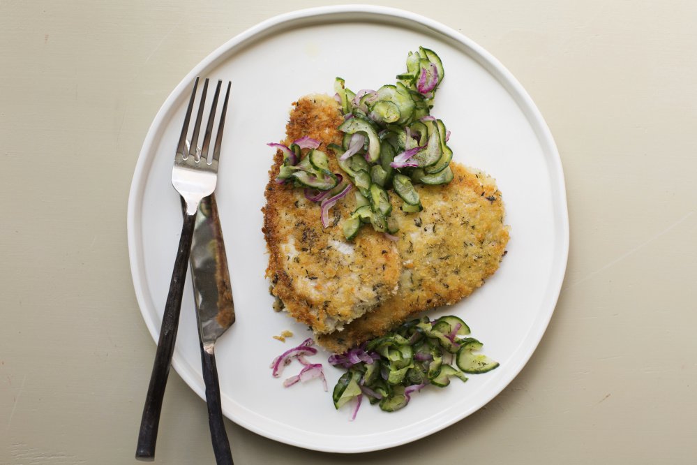 Tangy pickled cucumbers complement lightly fried pork cutlets in this recipe.