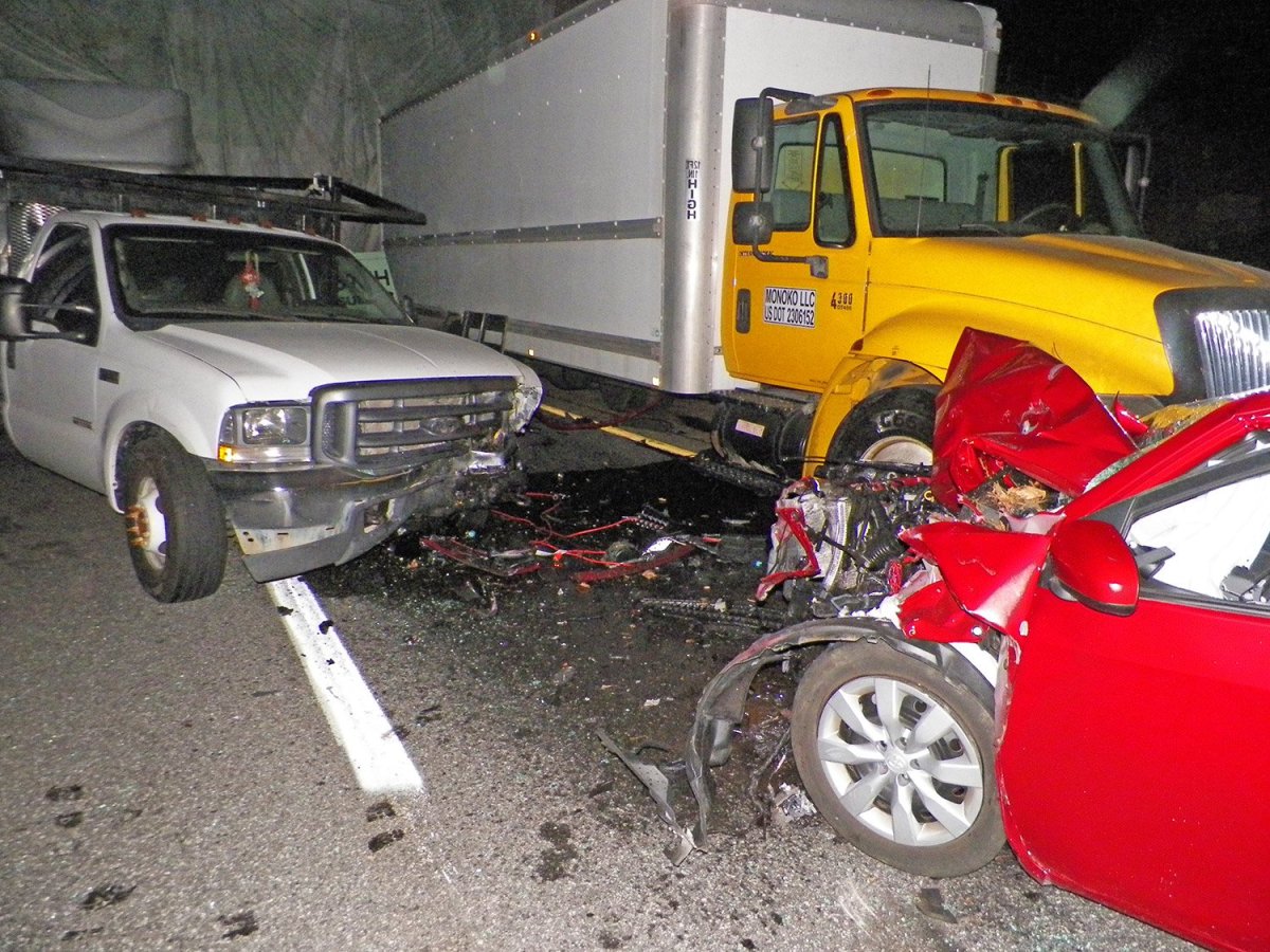 State police say a 21-year-old Hollis woman was driving north in the southbound lanes when she struck several construction vehicles.