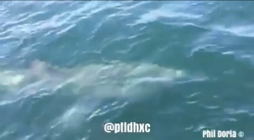 The shark, shown swimming next to a small boat, was believed to be a great white by the narrator of the video but is later identified as a common basking shark.