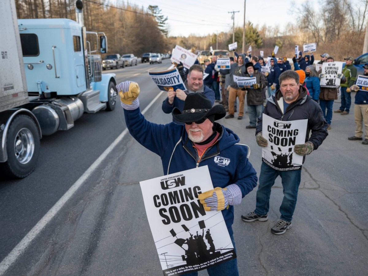 Members of United Steelworkers Local 9 gathered along Route 201 in Skowhegan on Tuesday to make a more visible pitch for higher wages and better benefits.