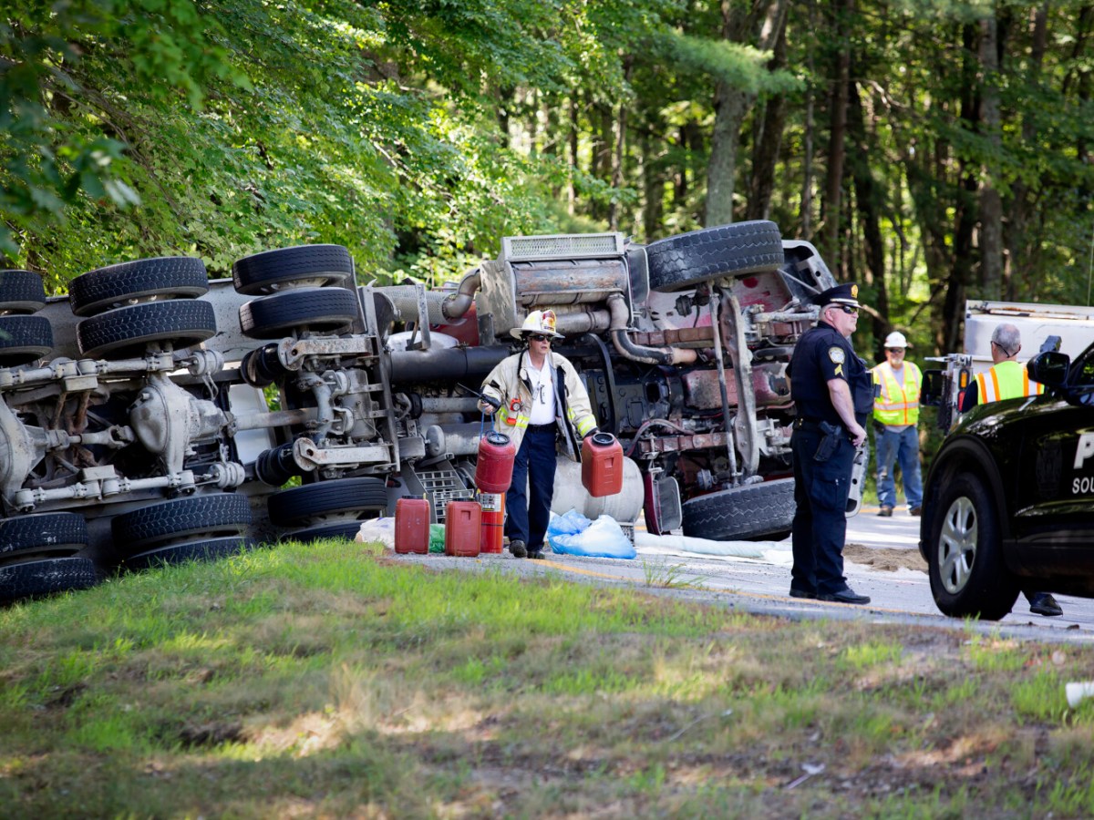 Cement truck overturns in South Portland, injuring driver, shutting access ramp