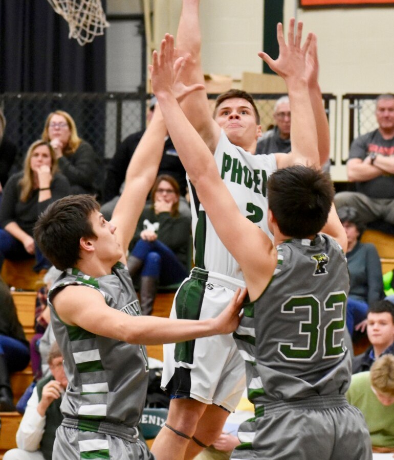 Senior Brandon Frey scores 10 of his game-high 21 points in the first quarter as the Phoenix deal the Ramblers their first loss of the season.
